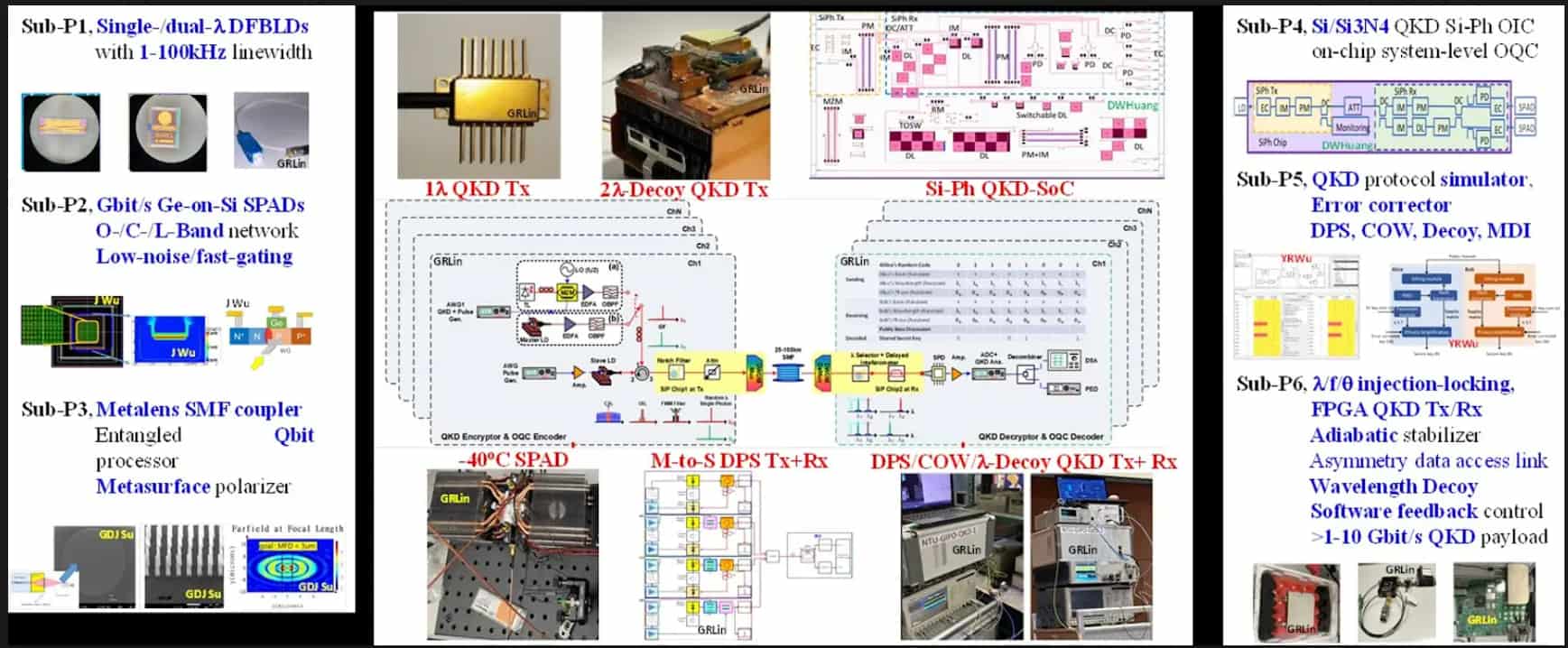 我們開發的 Si₃N₄-Si 積體化量子光子平台,專為連續變數(CV)量子光學操作所設計。此平台亦可應用於實現量子亂數產生(QRNG)晶片。該系統整合低雜訊、高速的轉阻放大器(TIA)電路板,並封裝於單一模組中,實現可攜式的積體化量子零差檢測(homodyne detection)。