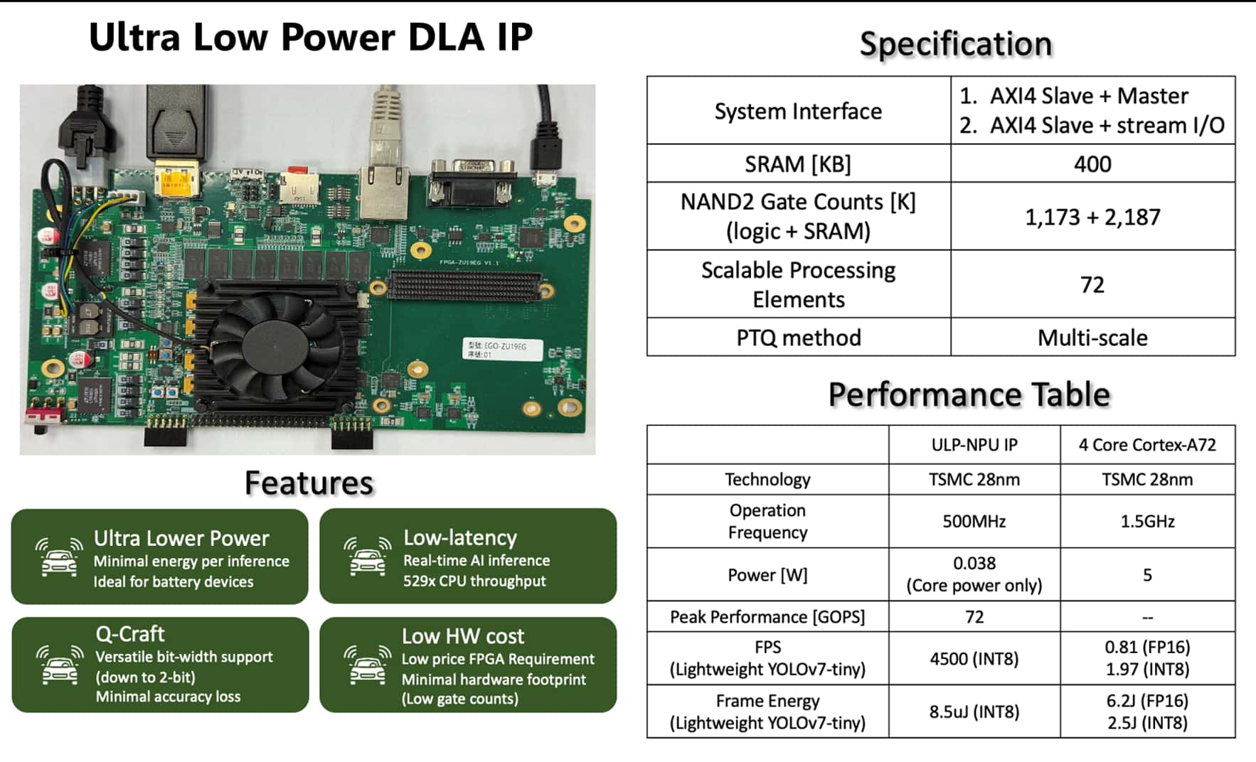 本技術針對低延遲、低能耗smart LiDAR系統,發展了一低功耗、高效能AI推論引擎,透過模型輕量化技術與模型快取技術,大幅度減少AI推論時的頻寬需求,處理輕量化 YOLOv7-Tiny模型時,可以僅用38mW實現4500FPS,適合低延遲、低能耗需求之邊緣應用。