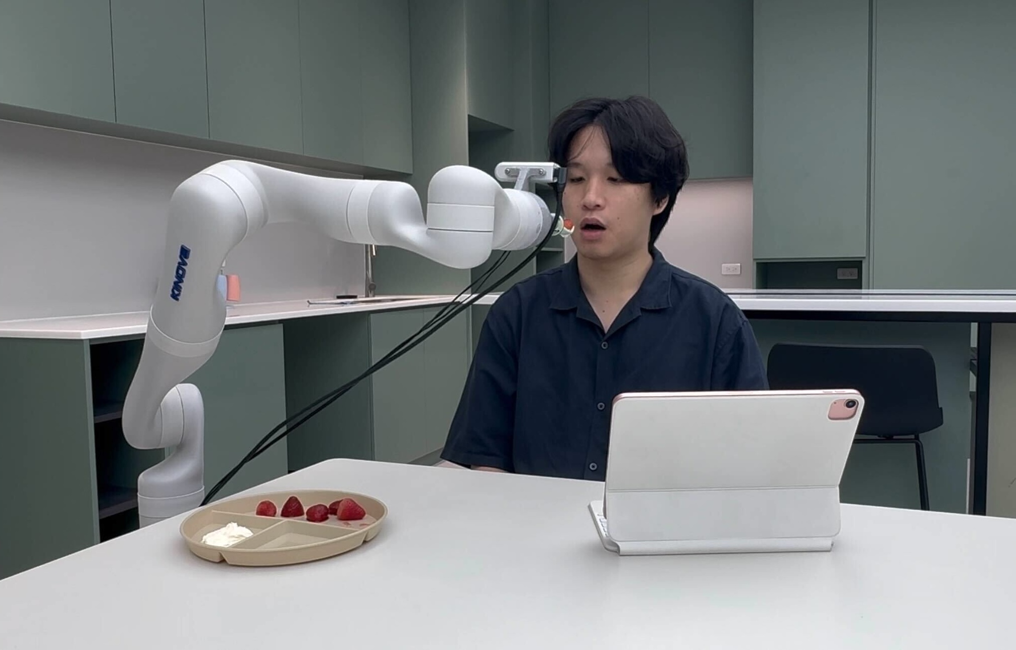 本技術為輔助餵食機器人系統,結合語音、視覺與深度感測,支援語音與面板操作,協助高齡與行動不便者在缺乏照護下安全進食。系統具備潑灑風險預測與即時動作調整功能,提升進食過程安全性與穩定性。展示空間設置RGB-D感測器與機械手臂,進行完整感知與餵食流程。整體設計採模組化架構,具高度擴充性,適用於長照、居家照護與智慧醫療場域。