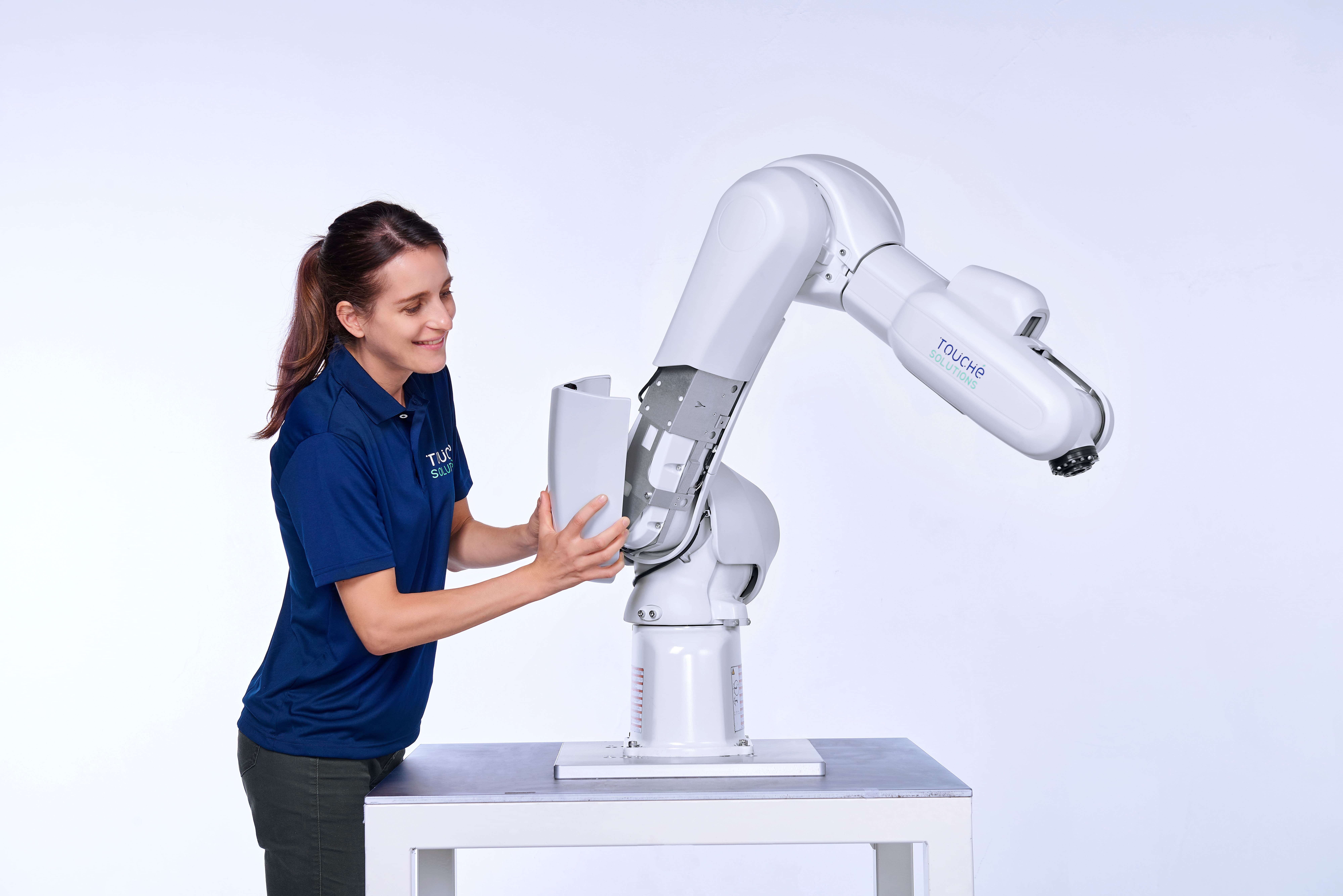 T-skin是一種高速反應的觸碰急停系統,適用任何機械手臂與工業應用情境,碰觸表面上的任何地方,都會立即停止,可立即提升機械手臂的安全防護、釋出產線大範圍空間。