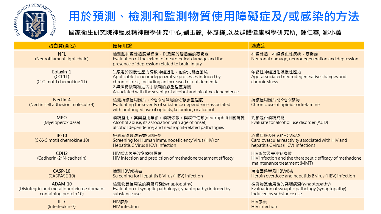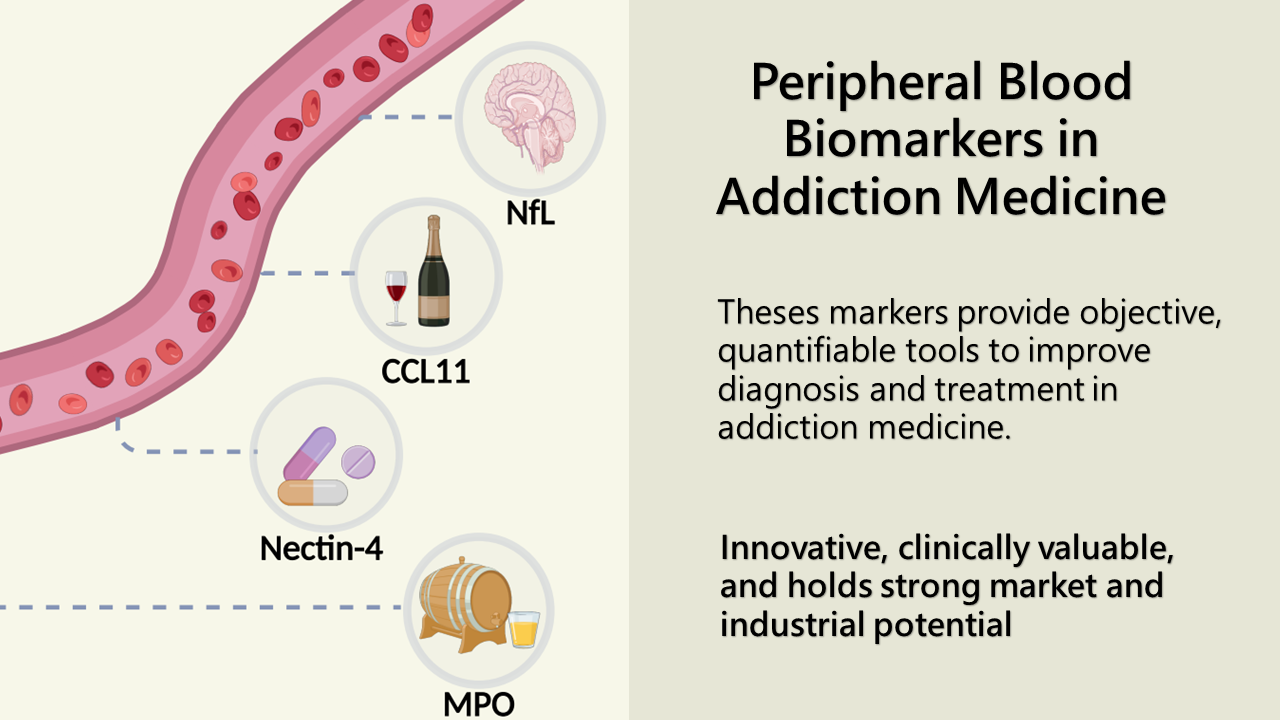 本技術具高度產業應用性,可導入臨床診斷、精準醫療與遠距照護,提升成癮與腦損傷的量化評估。生物標記可整合至高敏感度平台(如SIMOA、ELLA),開發新型檢測產品,並支援個管師與臨床人員進行個人化介入。亦具公共衛生與教育訓練價值。