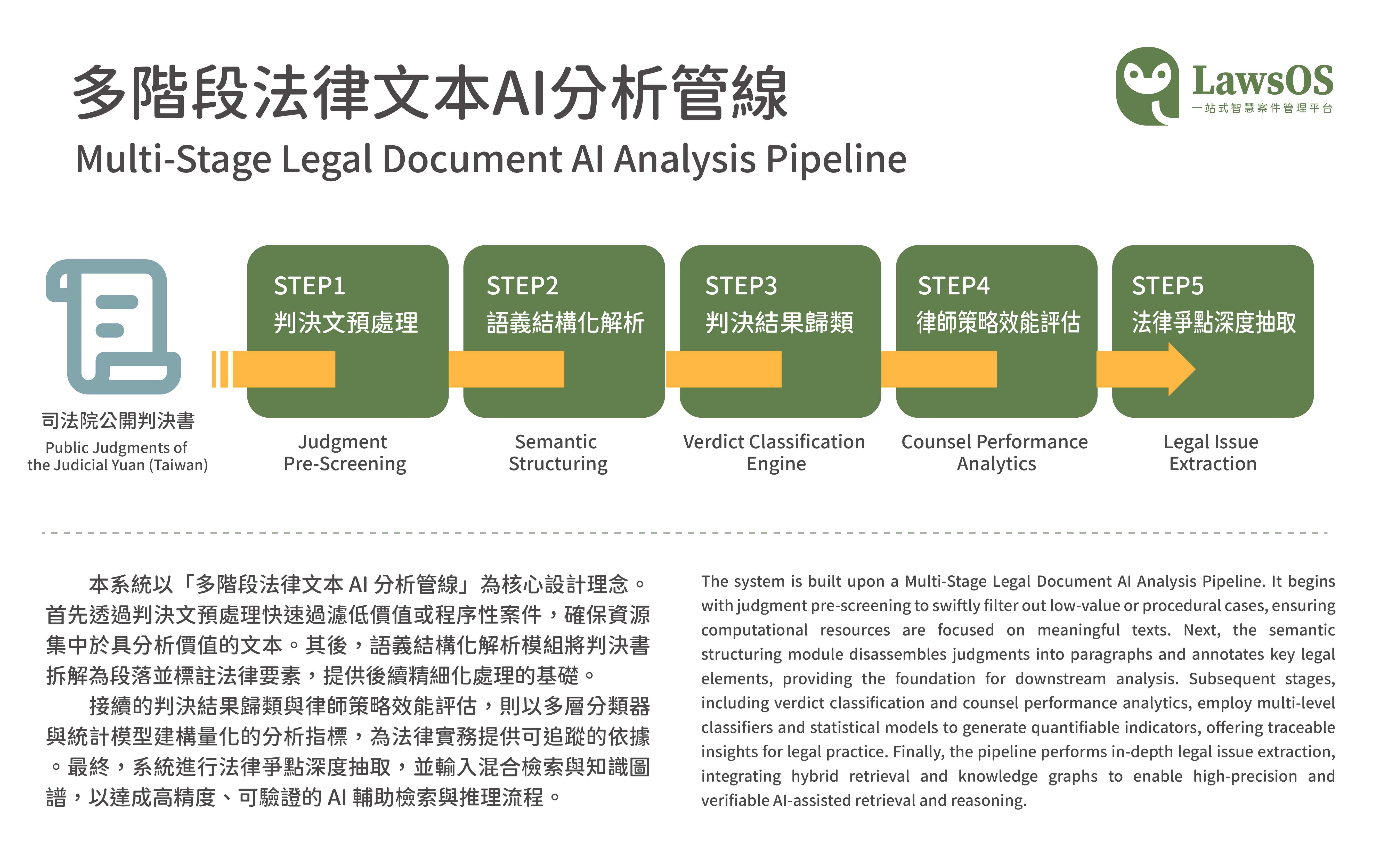 就是要勝訴團隊開發的 LawsOS 融合自然語言處理、機器學習、深度學習與向量化檢索技術,專注智慧訴狀分析、判例相似度、法條推薦。