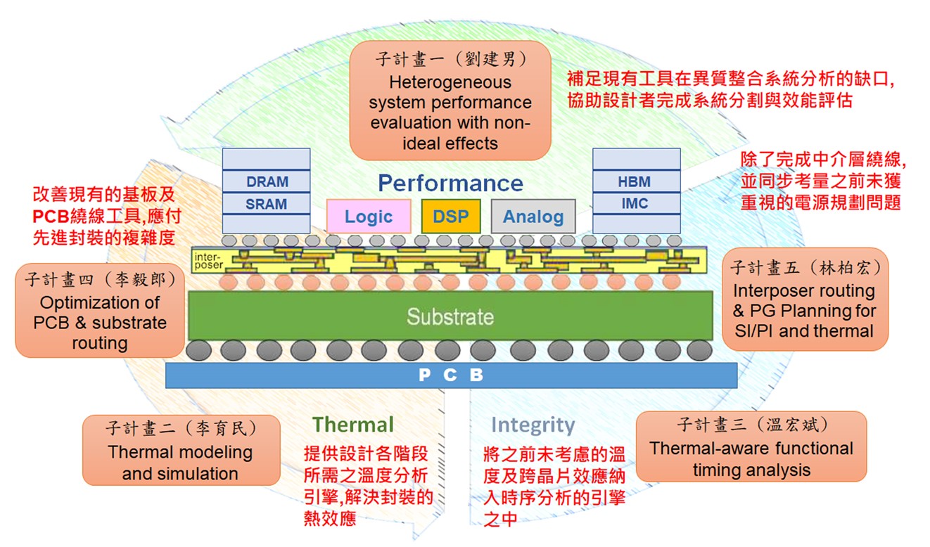 為了因應先進封裝所帶出的各種新興設計問題,本計畫提出一連串的EDA工具鍊,從異質整合系統的整合及效能評估,到全晶片的熱模擬技術及功能時序分析,一直到晶片、封裝與PCB的實體設計與優化,我們都有對應的規劃,希望可以解決此類晶片的設計瓶頸。最後,我們也會跟工研院合作,將本計畫所產出的成果串接到工研院開發的EDA平台之中,形成一個完整的EDA流程供廠商使用,以真正發揮協助國內產業開發先進封裝產品的目標。