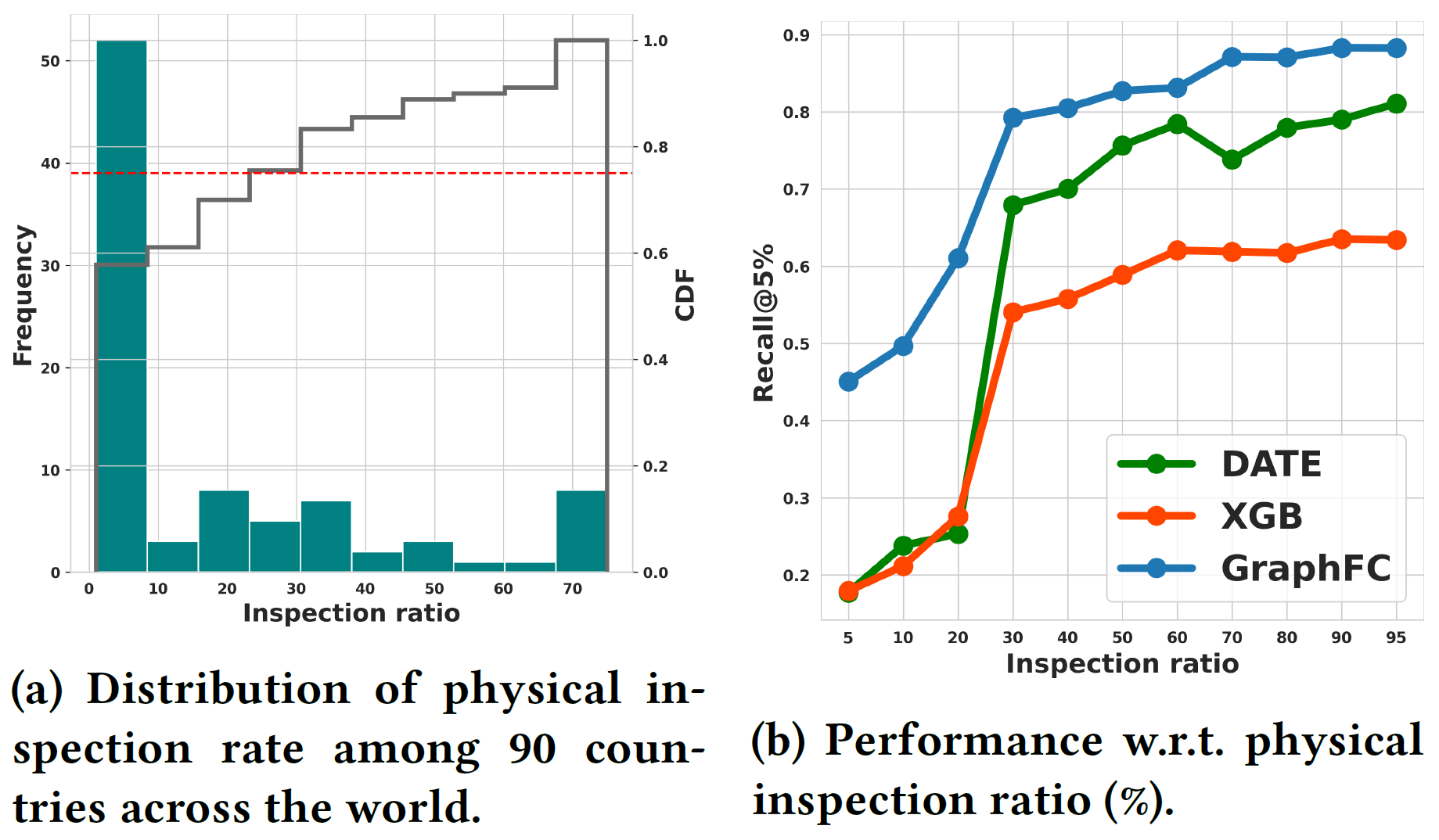 隨著全球貿易連結性增強,進口詐欺隨之增加。面對龐大交易量,海關僅能檢查少量申報,我們開發AI演算法GraphFC,只需極少量標記資料即可訓練,能準確偵測違法進口申報。此技術與世界海關組織WCO合作,已在非洲數國進行測試。成果發表於頂尖國際會議ACM CIKM 2023,展示台灣AI走私偵測重大貢獻。