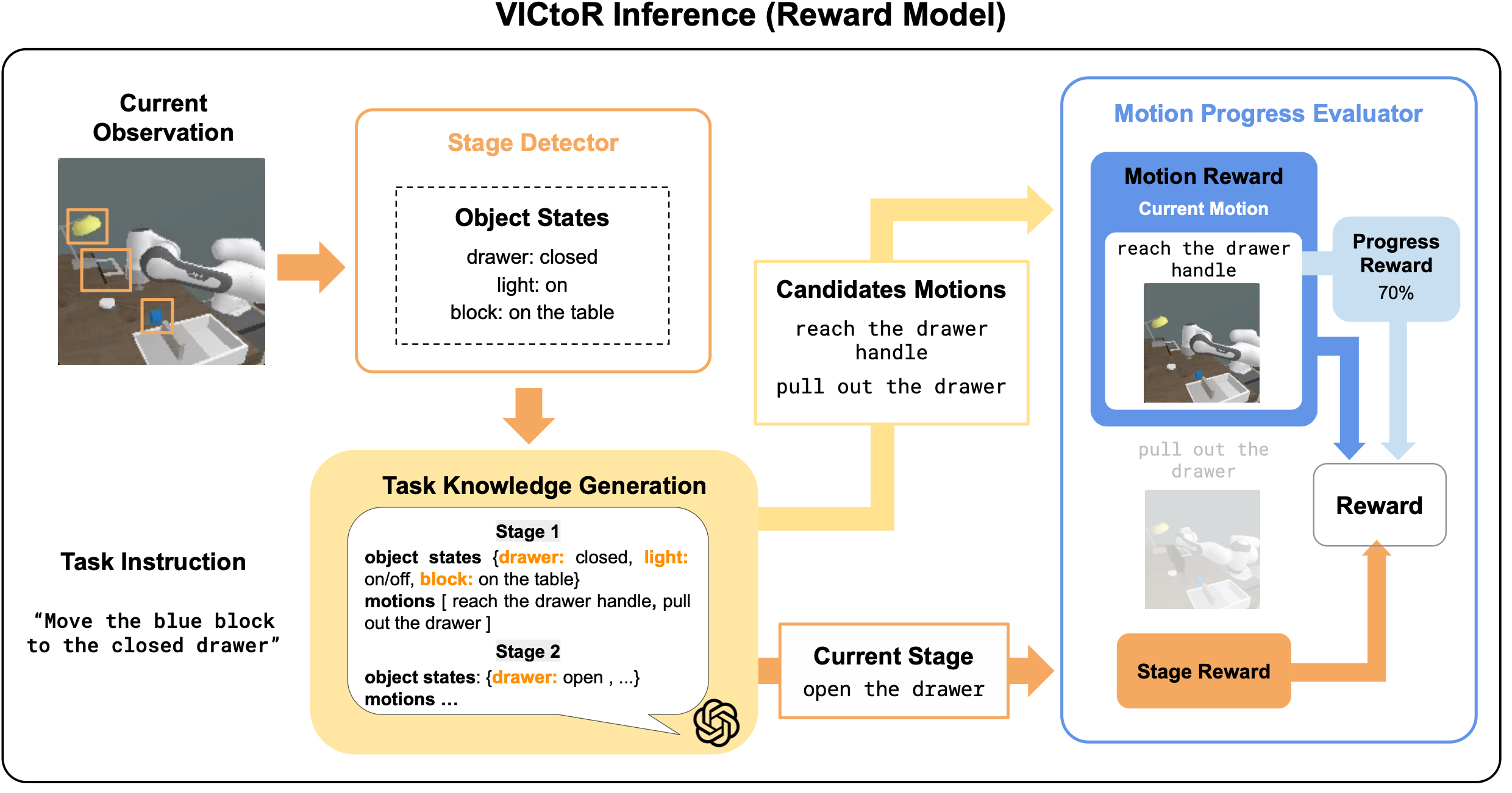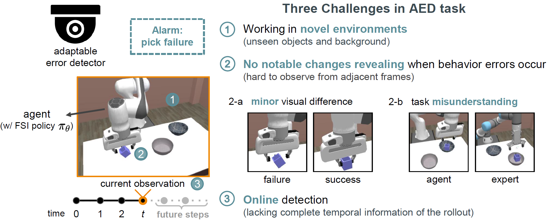 機器人在真實場域面臨三大挑戰:需大量專家示範、缺乏任務指導、執行安全疑慮。我們提出三項對應:(1) SCAN以注意力選取關鍵示範,加速學習;(2) VICtoR融合對比學習與多模態模型生成細緻任務指導;(3) PrObe以特徵一致性偵測異常行為。成果已獲AAAI、NeurIPS與ICLR頂會肯定。
