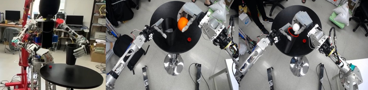 本機器人具備14個自由度雙手臂與仿生靈巧手,結合立體視覺與AI辨識技術,能精準執行物件抓取與力道調控,適應多種形狀與材質。可應用於餐廳進行物品擺放、遞送等任務,於物流倉儲執行搬運、分類與取放作業,展現在智慧餐飲與自動化物流場域中之高實用性與產業應用潛力。