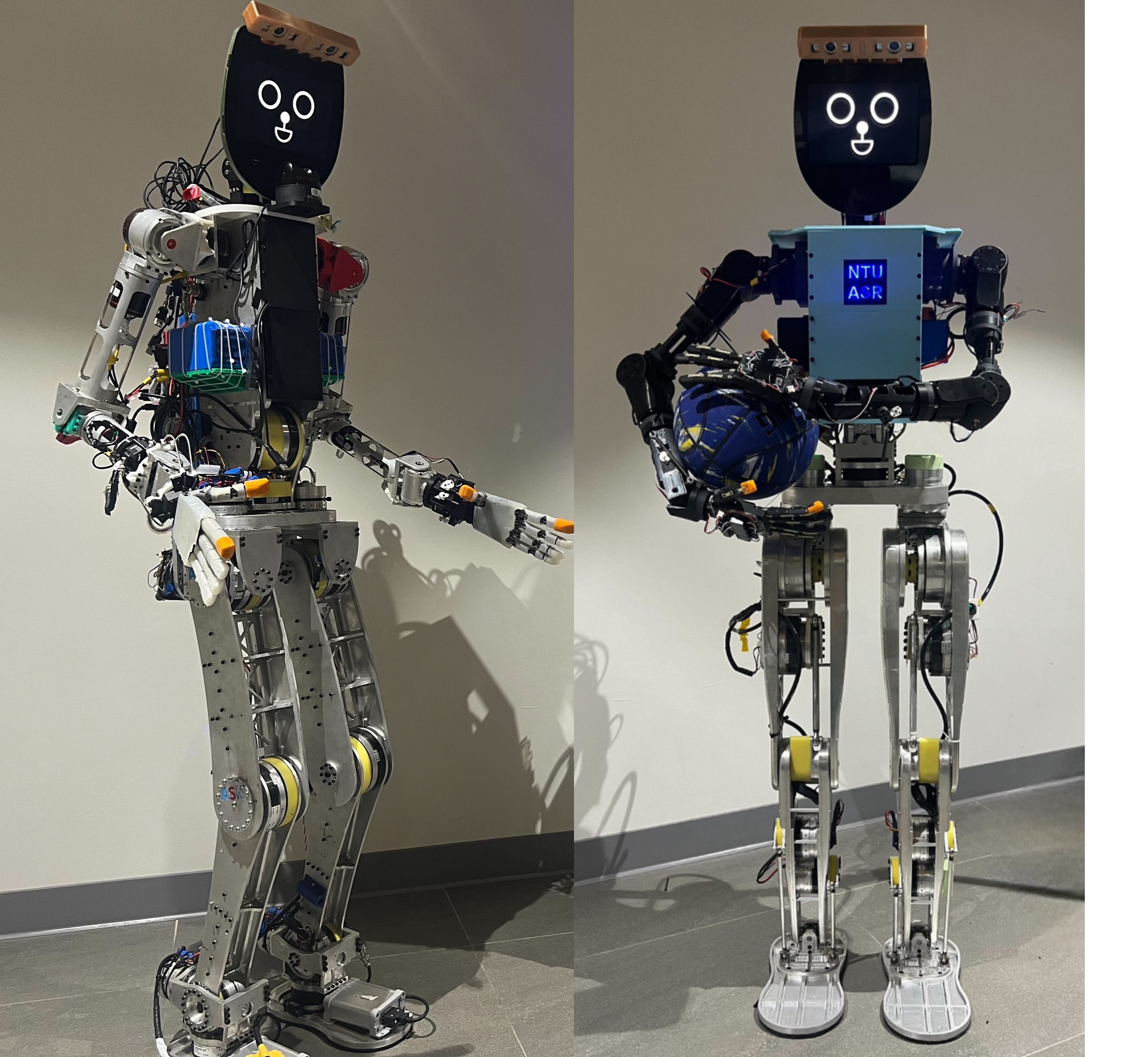 本計畫研發一款雙足人形機器人(身高160公分),全身共搭載44顆馬達,並整合多種感測器模組(如雙目立體視覺、慣性測量單元、RealSense 相機等),且具備14個自由度的雙手臂與靈巧仿生手掌,搭配多項人工智慧技術,展現智慧型人形機器人在未來應用場域(如餐飲、物流等)中的高度潛力與實用價值。