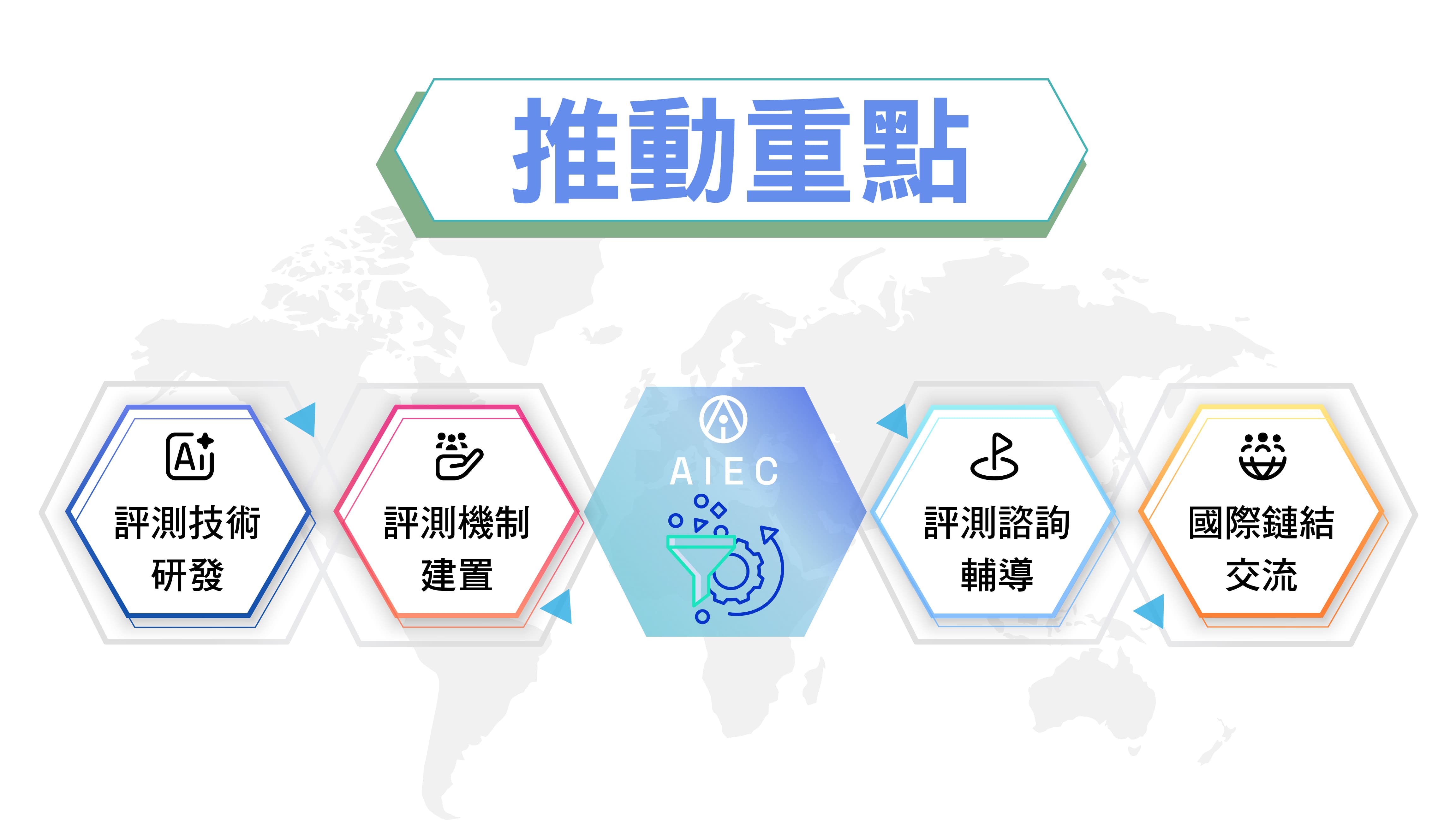 數位發展部為建立符合國家與產業需求之人工智慧(AI)產品與系統評測機制,並健全國內AI評測制度之發展環境,於2023年12月成立AI產品與系統評測中心(AIEC)。AIEC以兩大主軸「評測環境」與「國際接軌」為核心工作,建立我國自主AI認驗證體系與符合國際規範的評測系統,提供產業AI驗測服務,進而接軌國際達到相互認可之目標。