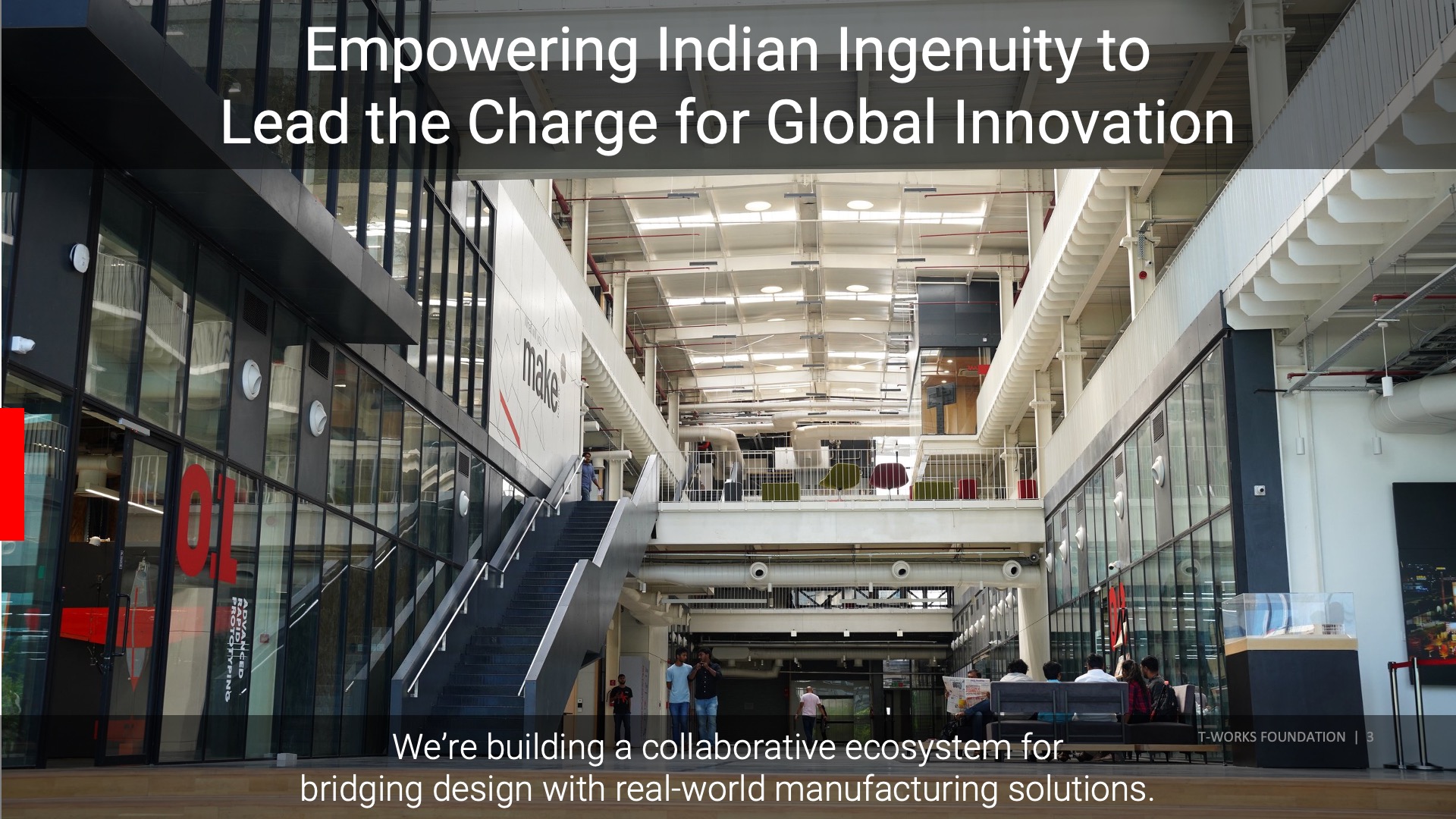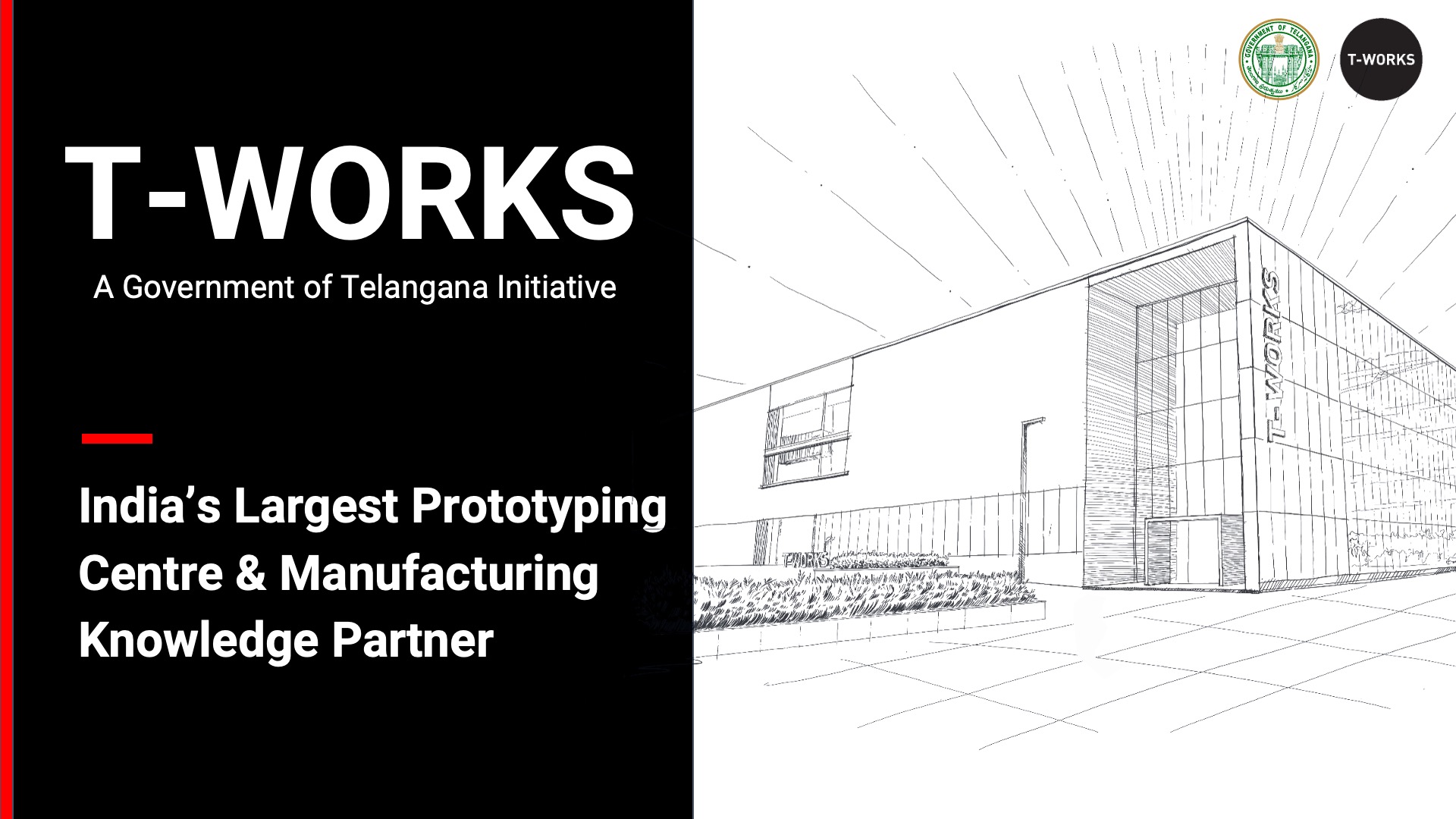 Founded on November 28, 2017, T-Works began its journey as a catalyst for hardware product innovation after recognizing the gaps in our journey towards the innovation era.In March 2022, T-Works opened its doors as India's largest prototyping centre with its Phase-I building spanning across 78,000 square feet, located in Raidurgam, Hyderabad. Equipped with industry-grade tools, T-Works offers an unparalleled experience for students, makers, innovators, corporates, and entrepreneurs to bring their ideas to life.