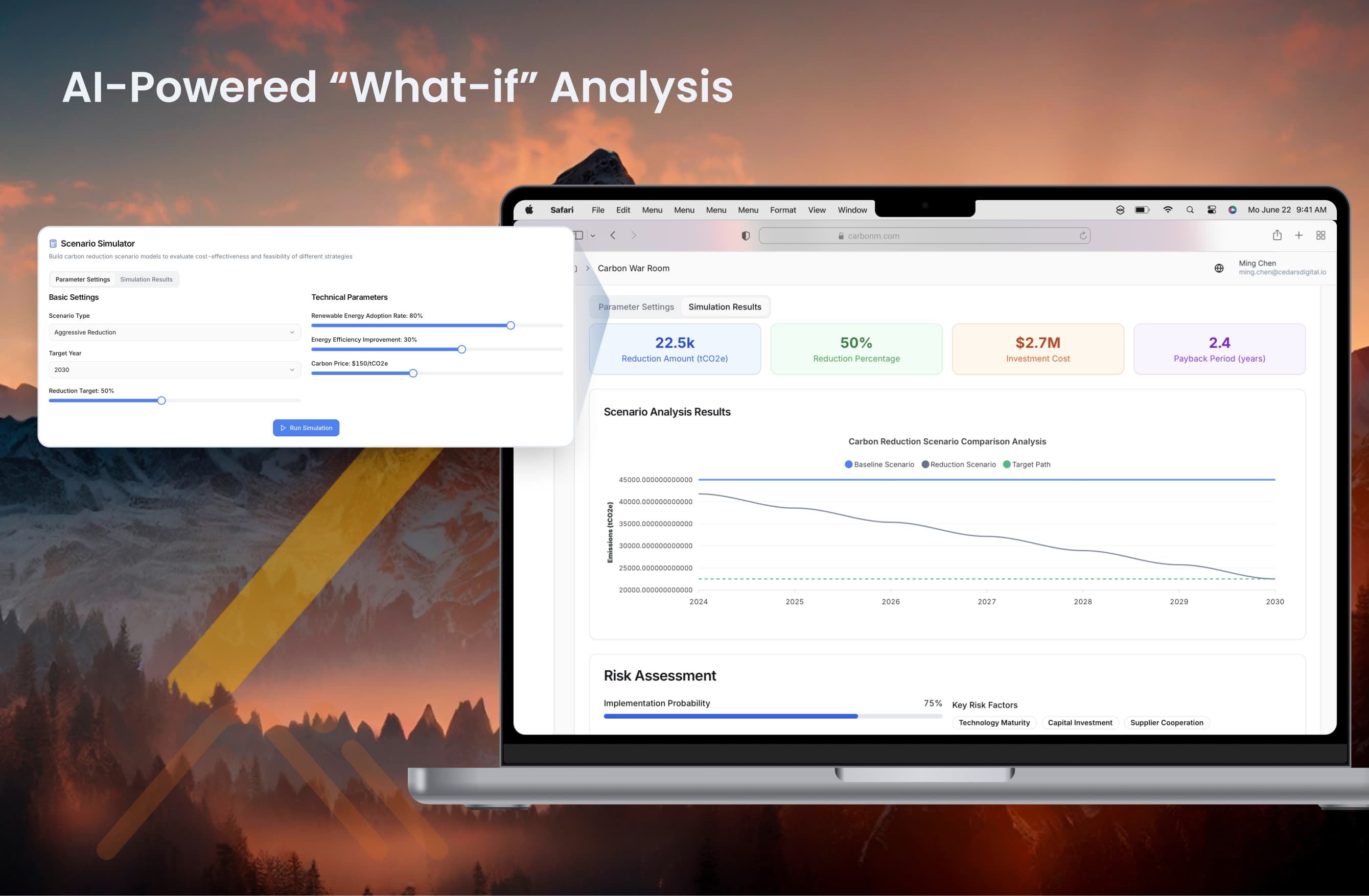・ Decision-to-Action: Instantly simulate “What-if” scenarios and generate the most suitable decarbonization strategy recommendations.