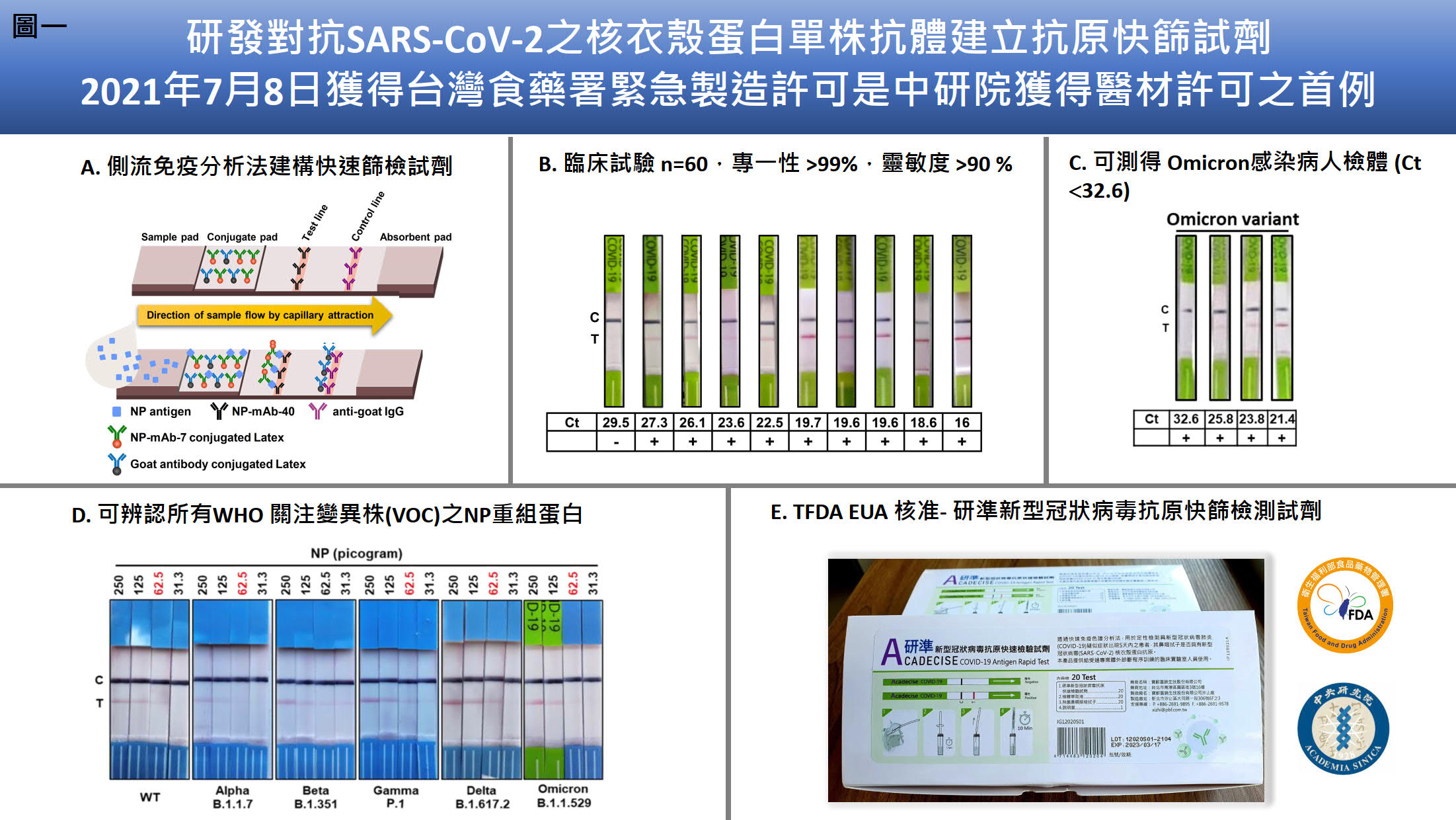 研準新冠病毒抗原快篩試劑已通過臨床試驗,獲得台灣食藥署的緊急製造核准,是中研院獲得醫材許可之首例,待製造經銷合約簽署後,即可上市投入防疫檢測任務。廣效性中和抗體除了運用於治療,亦可使用於預防,幫助免疫低下族群快速大量提升中和抗體濃度,預防新冠肺炎中重症的發生。