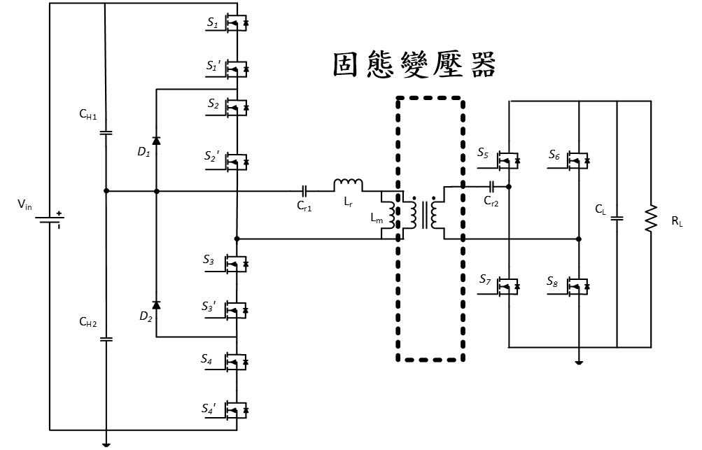 本方案利用ISOP的模組化架構,再加上固態變壓器的應用,輸入兩組10 kVDC串聯,輸出並聯來達到高壓側電壓 20kVDC 與低壓側電壓 400VDC之間的電壓轉換。此方案提高頻率至50kHz以達到體積縮小和提高效率的效果,並可以改善傳統變壓器帶來的缺點,且適用於多規格之再生能源。