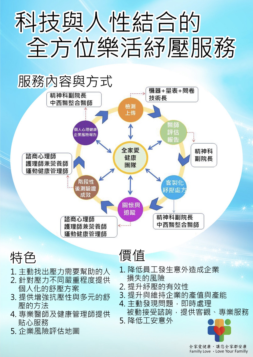 2.從壓力風險檢測、風險分類、提供客製化紓壓處方、專業溫馨的服務、階段性後側、提供個人與企業心理健康風險評估報告,建立一條龍的壓力管理模式。