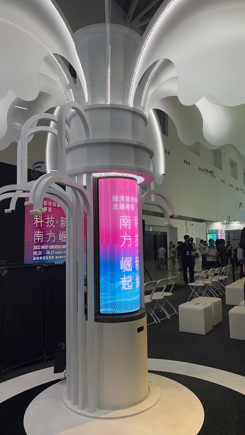 亞灣祈福樹整合了科技與藝術的結合,在精美的裝置藝術下,包含了以下幾項技術特點:1. 中間的樹幹是3D曲面螢幕,目前這個Mini LED曲面顯示器的可撓程度可以達到最小的曲率是75 mm的程度,大概就像一瓶大瓶的礦泉水一樣的大小!而且點距只有1.2 mm,是目前市面上最小點距的可撓式顯示器,可以顯示出非常精細的影像畫面。2. 透明顯示器:祈福許願樹上方吊掛的是採用透明顯示器製成的「祈福許願卡」,這一片透明顯示器是全彩顯示器,每一個點之間的點距只有0.75 mm,所以可以呈現非常細緻的內容,包含文字、圖片、影片等,而且透明效果達到了40%的水準!最特別的是,這是目前全球第一款可以三面拼接的透明顯示器!所以可以根據不同的應用情境,拼接成最合適的顯示尺寸。3.搭配「透明顯示遠端互動技術」,讓民眾可以透過LINE傳遞祝福文字。除了在祈福許願卡上面顯示祝福訊息之外,也可以在祈福許願樹的樹幹上清楚的呈現出來自世界各地最真誠的祝福文字!