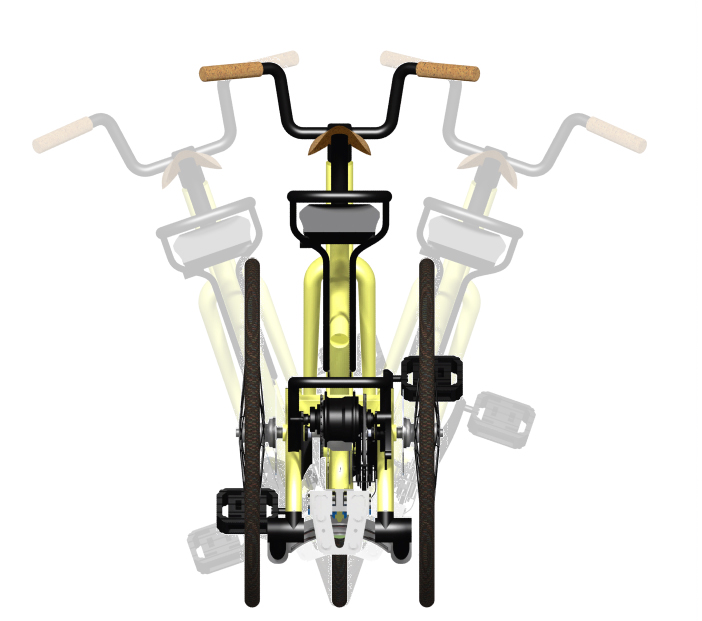 載貨自行車近幾年於歐美蔚為流行,用以載貨或載人等需求,但現行載貨自行車因軸距長導致前輪龍頭轉向不靈活,騎乘學習曲線長。本技術運用獨家專利傾車控制系統,以位於地面的縱向中心線為其傾車軸線,使軌道上的滑動阻力極小,大幅提升轉彎騎乘安全及操控性,於騎乘時,傾車控制系統可隨車速自動釋放或鎖定傾車功能,低速時運動靈活,静止時不需人力支撐。同時搭配超窄車身設計,可於城市中穿梭無礙。