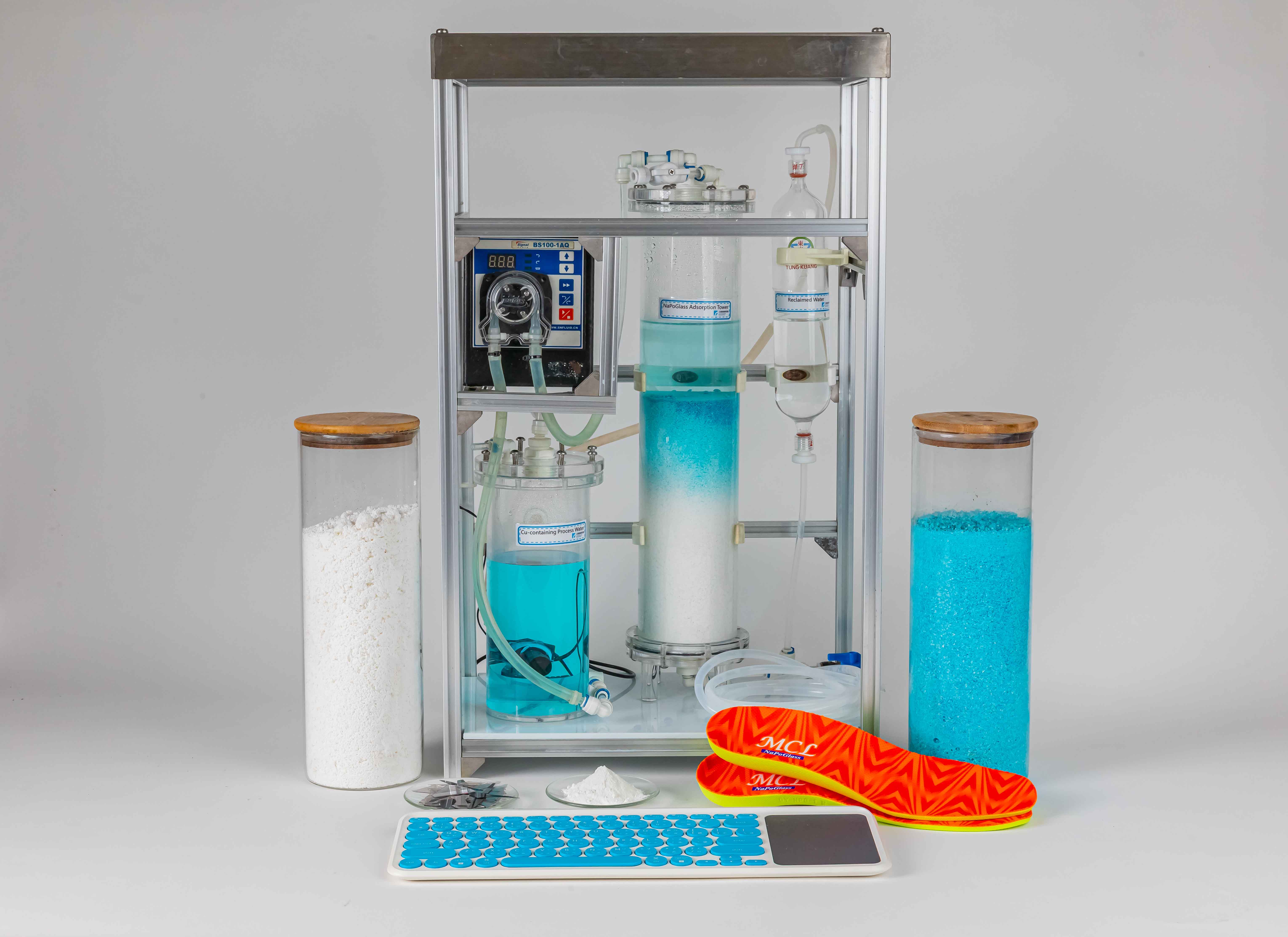 創新經濟館 | 材料化工與奈米/機械與系統水五金電鍍為國內的隱形冠軍產業,然而產生的重金屬廢水,普遍仰賴化學混凝法,不僅金屬與水資源不易循環,產生的大量污泥造成二次環境污染。NaPoGlass是一種高穩定性的奈米孔洞玻璃材,可用無機氧化物搭配廢棄玻璃製作,具備優異的金屬離子吸附與可重複使用能力,能取代傳統化混方式。此材料不但可回收金屬、再生水源,甚至自身亦可循環使用。此外,捕捉後的NaPoGlass還可轉製成抗菌、除臭等機能產品,拓展應用至民生與醫療領域,落實真正的「減廢、循環、高值」。目前技術已導入10家業者實廠應用,共成功減少碳排100公噸、金屬循環500公斤及水資源回用1萬公噸,創造綠色循環新價值。