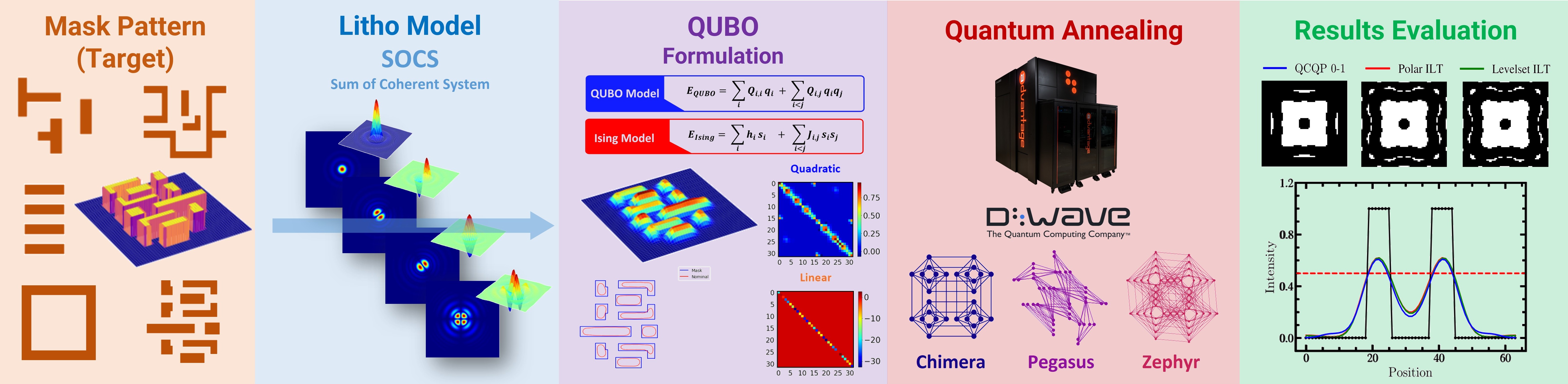 未來科技館 | 電子與光電技術簡介: 本計畫開發「量子退火光罩最佳化框架」,利用D-Wave量子退火器解決半導體微影中的光罩最佳化問題。傳統反向微影技術(ILT)面臨收斂困難、容易局限於局部最小值及計算時間過長等挑戰。我們將ILT問題轉換為二元二次無約束最佳化(QUBO)模型,運用量子特性實現快速全域最小值搜尋。研究建立了可應用量子退火的光罩最佳化框架,並探索其工業應用潛力,為半導體製造的下一代計算平台奠定基礎。 產業應用性: 首次實現半導體微影光罩最佳化的量子計算應用,嘗試突破傳統ILT的計算瓶頸。成功將高階成本函數轉換成二次的QUBO模型,在量子退火的基礎上達成理論上微秒等級的最佳化速度。使用動態成本函數修正技術,確保二次近似的準確性。此突破為半導體製造引入量子優勢,開創計算微影的新典範,為未來大規模量子應用奠定關鍵技術基礎。
