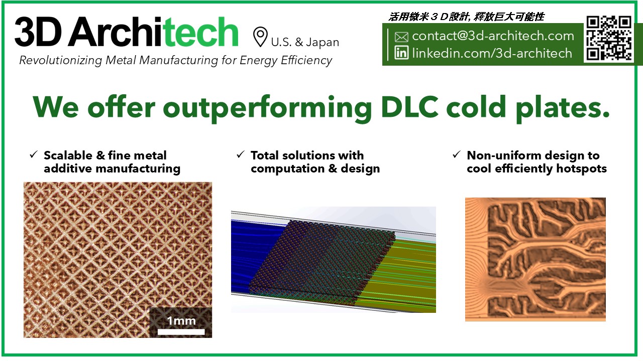 未來科技館 | 機械與系統Technology Introduction: 3D Architech’s core technology is a gel-based metal 3D printing process that achieves 10-micron resolution—10× finer than conventional methods—enabling custom, high-performance cooling and energy components at a fraction of the cost. Industry Applicability: Our gel-based metal manufacturing technology enables micro-architected copper cold plates tailored for AI chip cooling. It achieves custom micro-architected design with 10-micron precision, reduces electricity costs for data center cooling by up to 60%, and supports rapid customization for new chip designs, driving efficiency and scalability in the AI industry.