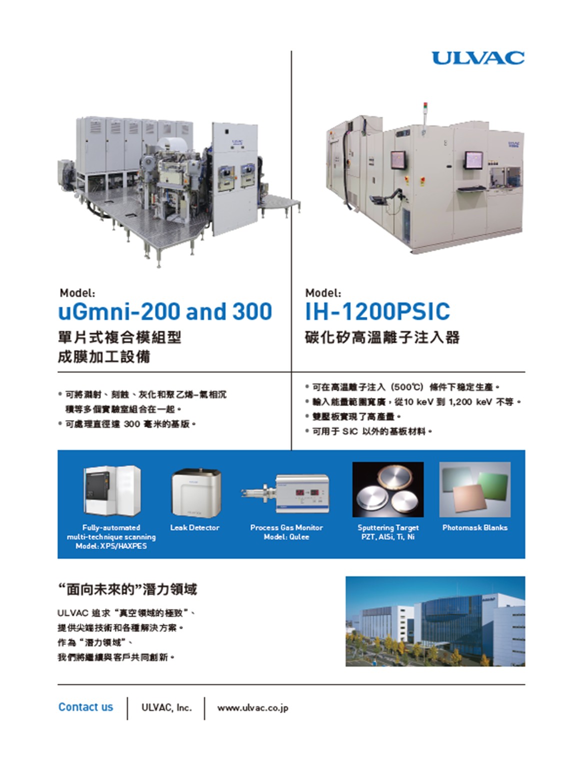 創新經濟館 | 資訊與通訊Technology Introduction: ULVAC has developed an advanced system for processing silicon carbide (SiC) materials. It enhances wafer stability, increases throughput, and reduces contamination, ensuring faster and cleaner production of high-quality SiC wafers. These wafers are ideal for high-temperature, high-frequency, and high-voltage applications, including EV chargers, industrial motors, and renewable energy systems. Industry Applicability: ULVAC’s high-energy ion implantation equipment for compound semiconductors is designed for industries needing advanced materials for high-performance devices. It supports mass production and prototyping, enabling devices with higher efficiency, reliability, and performance. Applications include automotive electronics, renewable energy, telecommunications, and industrial systems.