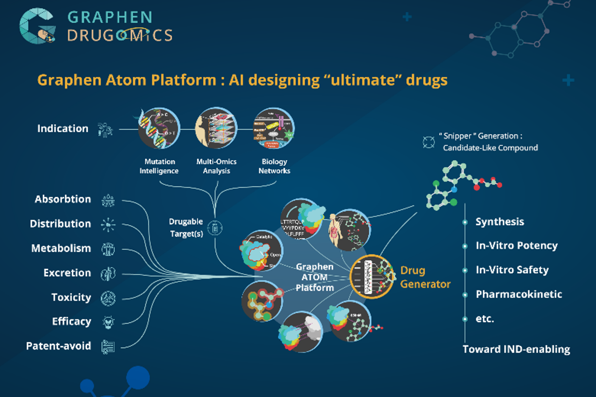 創新經濟館 | 材料化工與奈米The All-in-One Drug Generator is an AI-driven technology capable of precisely generating candidate small-molecule drugs based on specific therapeutic requirements. Developed by Graphen Drugomics Inc. and integrated into the Atom Platform, this technology is trained on both small- and large-molecule structures as well as experimental language, enabling it to perform accurate conditional generation and internal optimization in iterative cycles. Leveraging multimodal features, we integrate advanced drug design to support complex multi-target, multi-drug scenarios, improving the success rate of drug development. Utilizing precision small molecule generation technology, we design novel and effective drugs for a variety of diseases, shortening the early drug development process from the traditional 2-4 years to just 6-12 months.