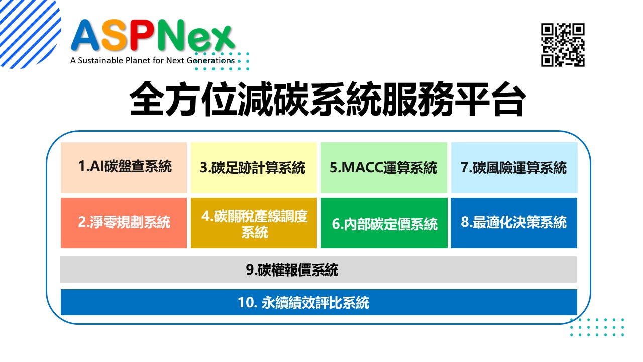 智慧永續館 | 綠能與環境技術簡介: ASPNex 是業界唯一顧問團隊自主研發、並擁有專利的數位碳管理平台,目前共有10大系統,包含溫室氣體盤查、CBAM計算、碳足跡與碳定價等模組,協助企業快速掌握碳排數據與風險,找出最有效的減碳策略,且可依不同需求選擇不同模組,協助企業以最低成本達成減排目標。目前已通過新加坡 IMDA 國際數位解決方案認證。 產業應用性: 本系統採模組化設計,具高度彈性,適用於製造業、電子業、建築業、物流、金融、零售等多元產業。無論是需應對 CBAM、進行碳盤查、設定減碳路徑,或ESG 評比,ASPNex 均可依企業需求選配功能,快速導入並串接既有系統。平台支援在地與國際標準,有效協助企業提升碳管理效率與因應淨零轉型挑戰。