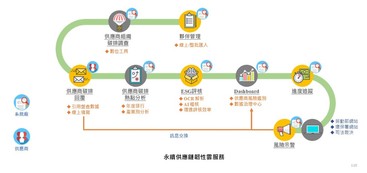 智慧永續館 | 農業相關技術簡介: 整合碳排管理與 ESG 評級機制,打造一套具備即時碳足跡計算、數位碳盤查、自定義 ESG 評估與 AI 智能稽核功能的雲端平台。透過鏈主企業與供應商協作機制,實現供應鏈範疇三碳排數據的回報、分析與熱點識別,有效提升企業永續治理效率。平台同時支援 API 串接企業內部 ERP/MES 系統,降低導入門檻,並透過實際導入案例引發潛在商業合作,展現其在永續轉型與供應鏈數據治理方面的可行性與產業推廣潛力。 產業應用性: 本平台專為供應鏈型企業設計,協助鏈主與其供應商進行碳資料交換與盤查資料整合,適用於製造、電子、車用、服務業等,協助企業提升碳管理與供應鏈永續治理能力。藉由鏈主與供應商協作機制,促進範疇三碳數據整合與風險識別,具備跨產業推廣潛力,亦有實際導入應用案例,展現其產業應用成熟度。