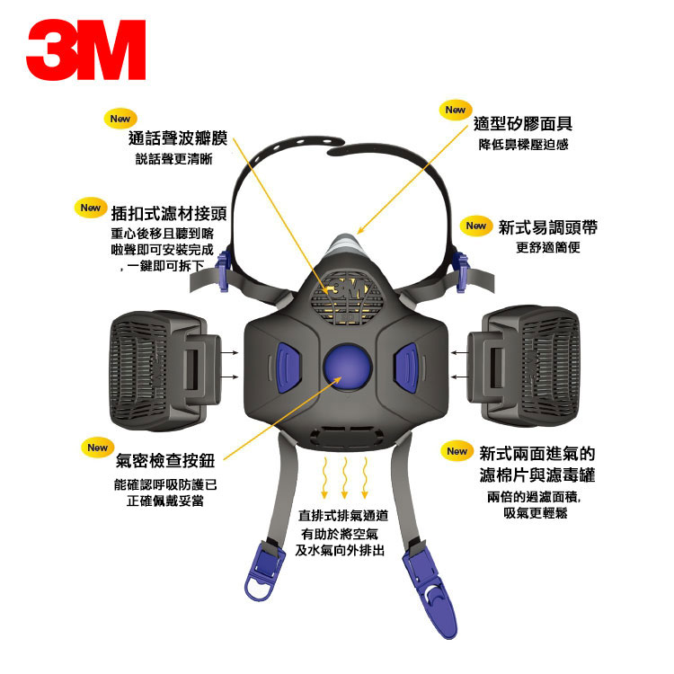 智慧永續館 | 資訊與通訊Technology Introduction 1. Designed with intuitive features, the 3M Secure Click Half Facepiece Reusable Respirator HF-800 Series helps protect workers from particulates and/or a wide variety of gases and vapors when used with approved 3M Secure Click filters and cartridges 2. Secure Click connection helps provide confidence that filters/cartridges are installed properly. 3. Easy, one-touch seal check helps increase worker confidence that the respirator is being worn properly. 4. The 3M™ Cool Flow™ valve effectively removes heat build-up and provides a cooler and more comfortable wear. The 3M Cool Flow valve also minimises the risk of fogging up eyewear 5. Individually wrapped for protection from contamination prior to use 6. Activated carbon layer reduces exposure to nuisance levels of organic vapor and odor.