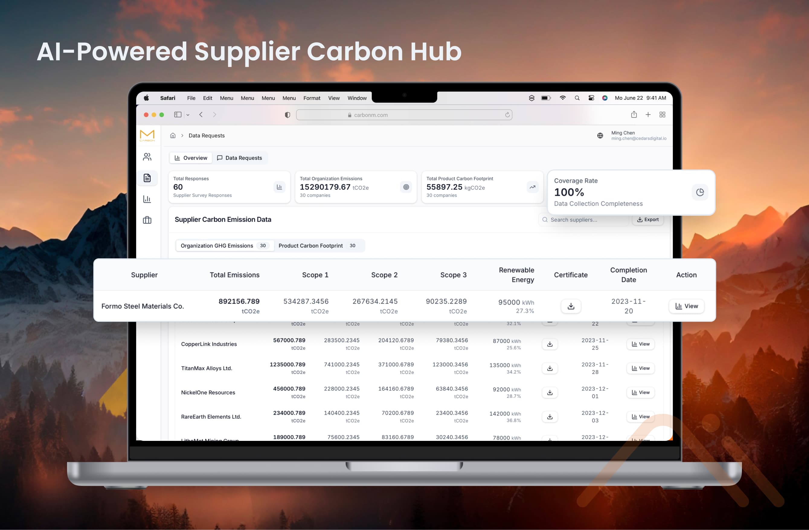 智慧永續館 | 資訊與通訊Technology Introduction: AI-Powered Net Zero Supply Chain Fast ・ Accurate ・ Actionable Scope 3 Solution At this critical moment in the net-zero transition, Scope 3 emissions from supply chains have become the greatest challenge for global brands and manufacturers. The AI-Powered Net Zero Supply Chain Module, integrating AI and automation technologies, helps enterprises overcome the bottlenecks of fragmented data, massive datasets, and complex decarbonization decisions. Our Core Value ・ Data Integration Accelerator: Consolidate and standardize carbon data across systems and suppliers with one click. ・ AI Data Engine: Automatically cross-check and complete missing data, precisely matching the right emission factors. ・ Decision-to-Action: Instantly simulate “What-if” scenarios and generate the most suitable decarbonization strategy recommendations.